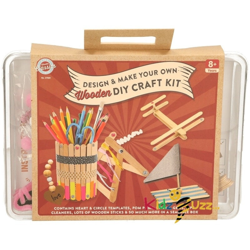 Craft set with wood lolly stick pipe cleaners pop poms and decorations.