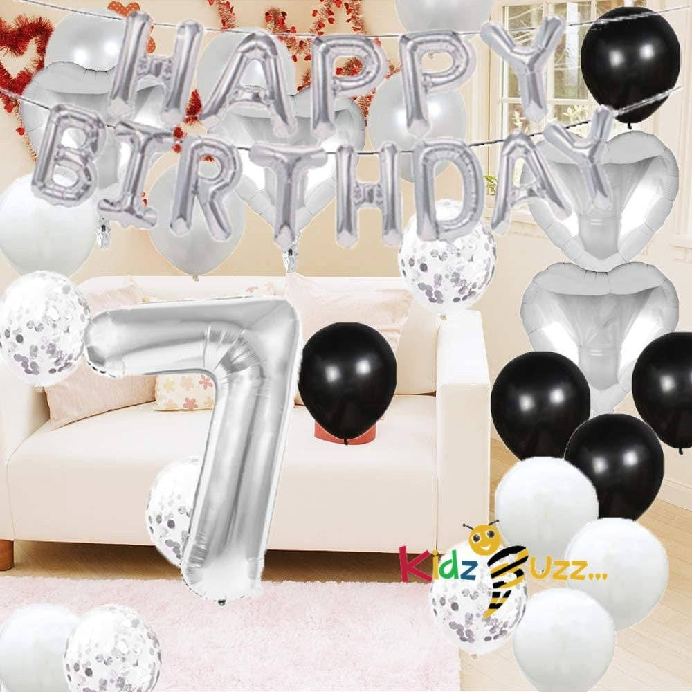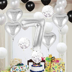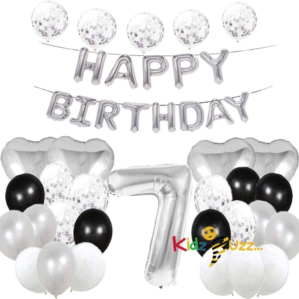 • 7th Birthday Supplies Package Includes: 40 Inch Silver foil balloons, 16 inch "HAPPY BIRTHDAY DAY" banner balloons,4pcs 18 inch  loving heart balloons,10 pcs Silver confetti balloons, 5pcs Black latex balloons,5pcs silver latex balloons and 5pcs white latex balloons.The birthday set is perfect for birthday celebration
