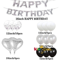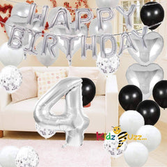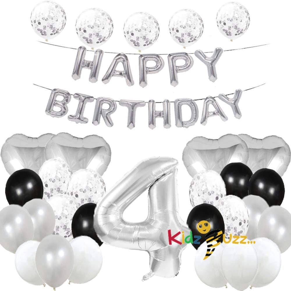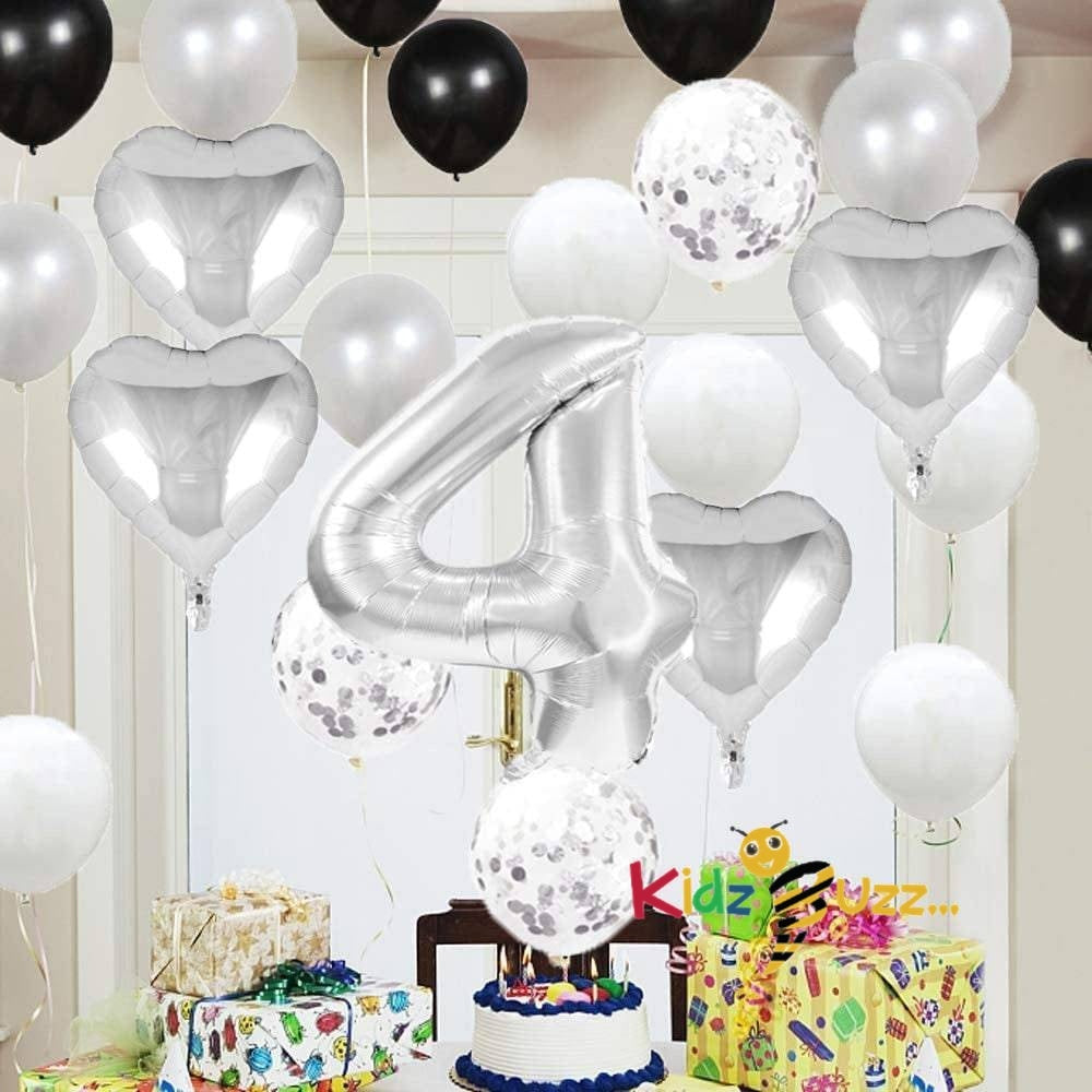 - 4th Birthday Supplies Package Includes: 40 Inch Silver foil balloons "4" set, 16 inch "HAPPY BIRTHDAY DAY" banner balloons,4pcs 18 inch mylar loving heart balloons,10 pcs Silver confetti balloons, 5pcs Black latex balloons,5pcs silver latex balloons and 5pcs white latex balloons.The birthday set is perfect for birthday celebration