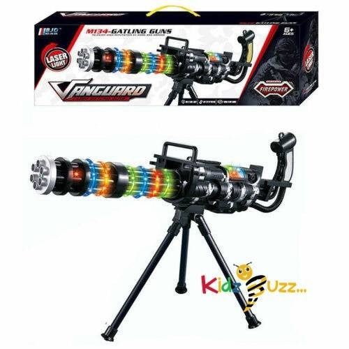 M134 LASER LIGHT GATLING TOY GUNWITH DAZZLING LIGHTS AND SIMULATION SOUNDCOMPLETE WITH SUPPORT STANDSUITABLE FOR AGE 6+REQUIRES 3 x AA BATTERIES (NOT INCLUDED