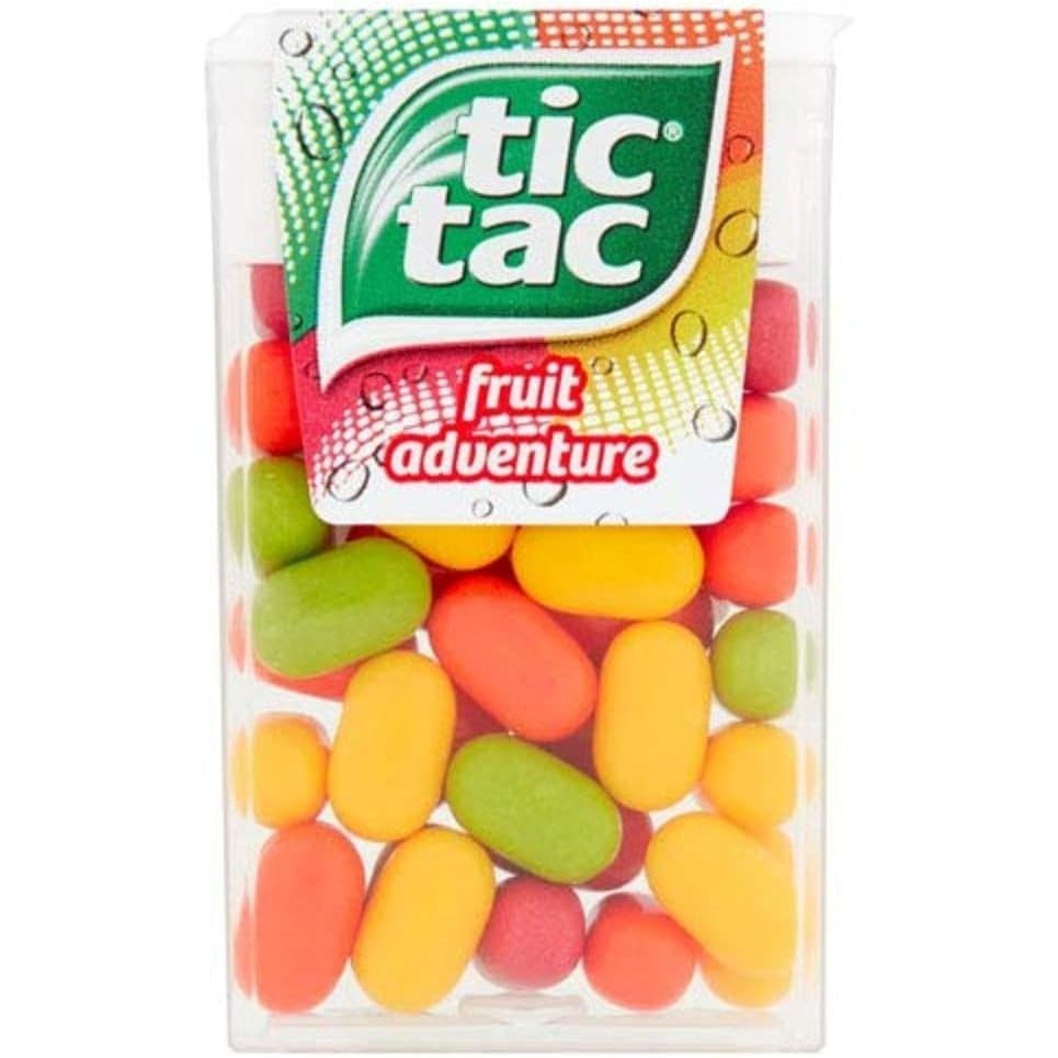 Tic Tac: refreshing little lifts. Ingredients: Sugar, Maltodextrins, Acids (Tartaric, Malic, Citric), Thickener (Gum Arabic), Rice Starch, Flavourings, Anticaking Agent (Magnesium Salts Of Fatty Acids), Colours (Curcumin, Beta Carotene, Carminic Acid), Powdered Passion Fruit Juice, Powdered Green Apple, Glazing Agent (Carnauba Wax), Antioxidant (Ascorbic Acid).