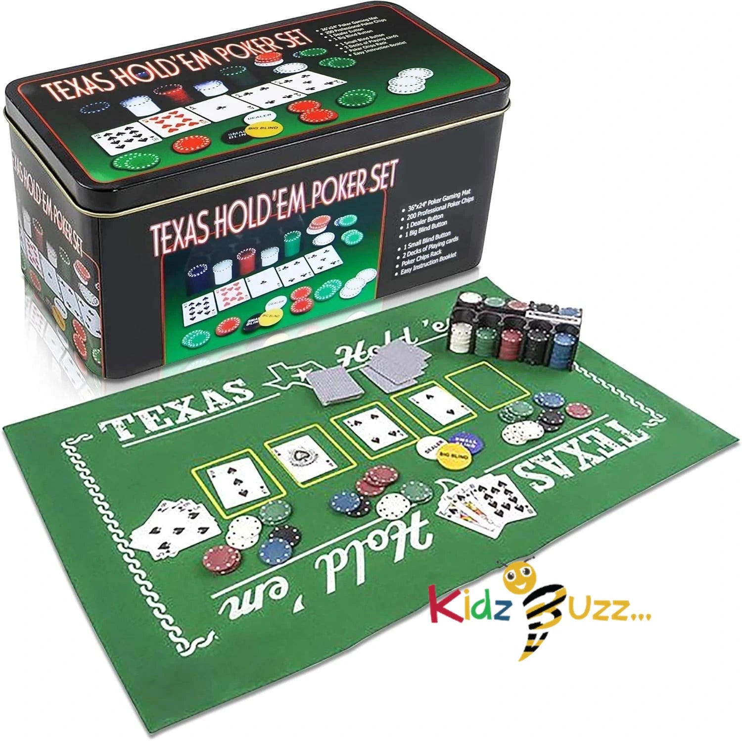 - COMPLETE SET: This kit comes with everything you need to fuel hours of Texas hold’em fun: 2 sets of cards, a mat, gambling chips and a plastic holder for the casino chips. Set it up, call up friends and family, and create fond memories as you test each other’s mastery of poker.