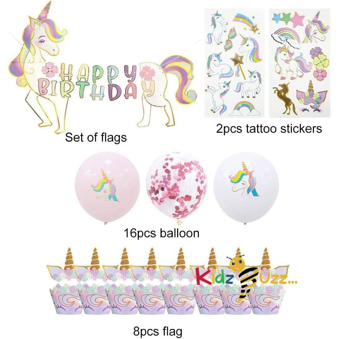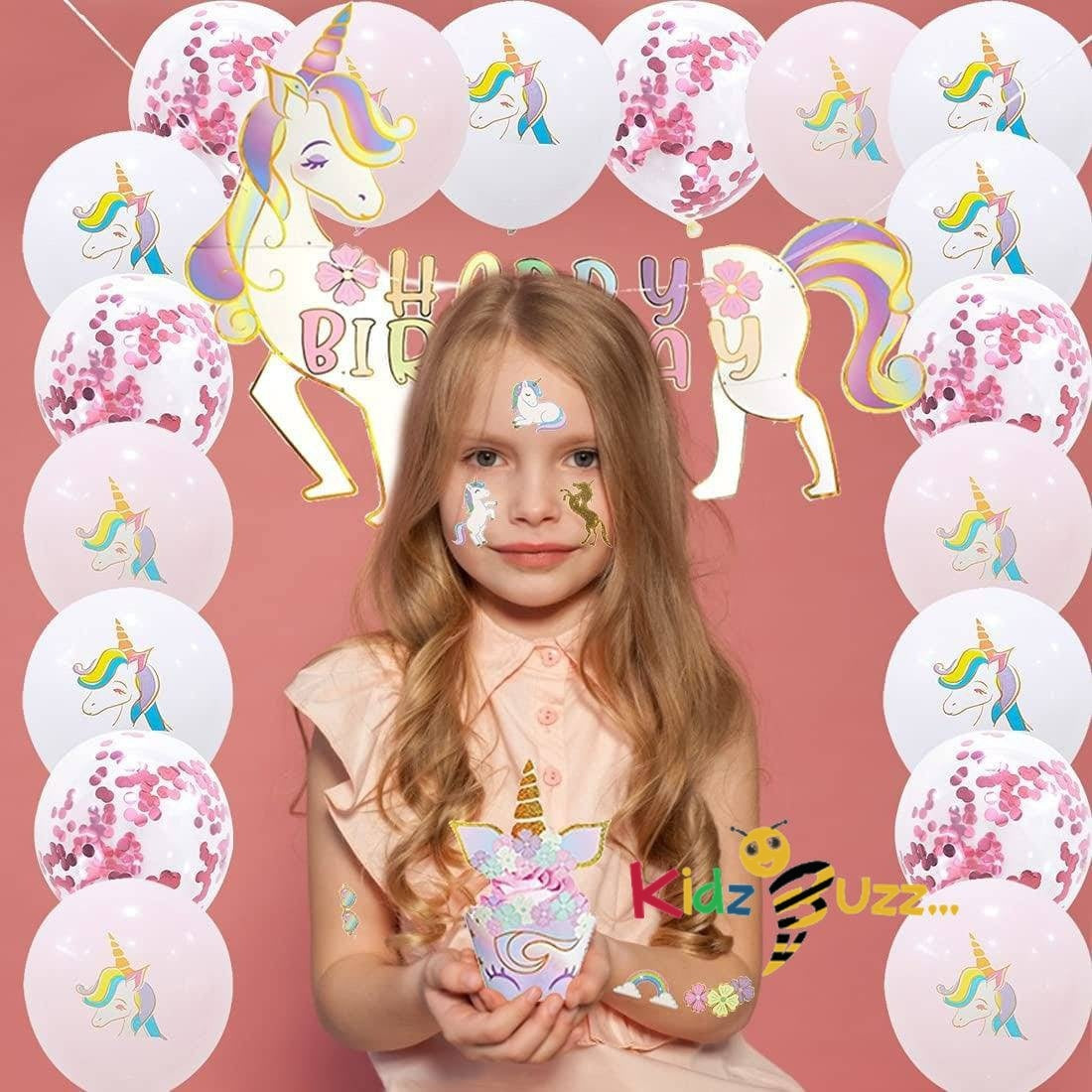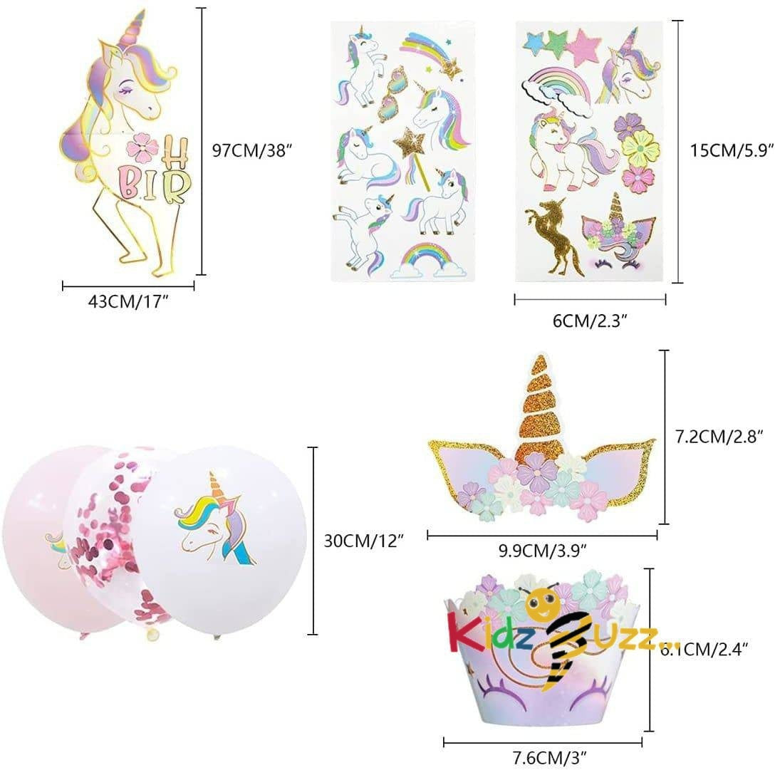 - 【Unicorn Balloon Party Pack】-The Pastel Unicorn Birthday Party Decorations set, includes that you will need for assembly: 16 pc unicorn latex balloon, 16 pc unicorn tattoos, 1 Unicorn Happy Birthday Banner, 8pcs Cake Toppers, double sides printed with gold unicorn horn.