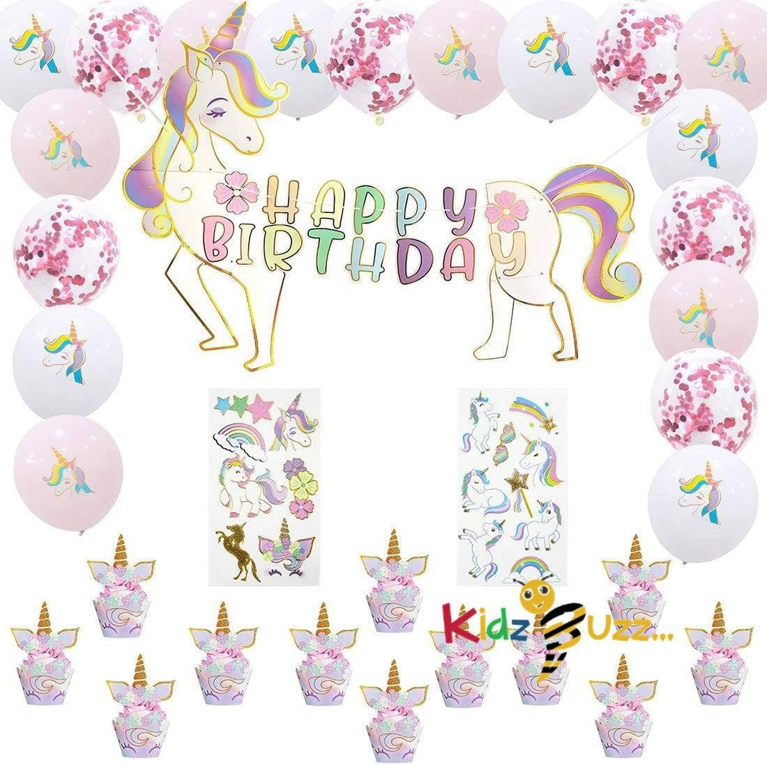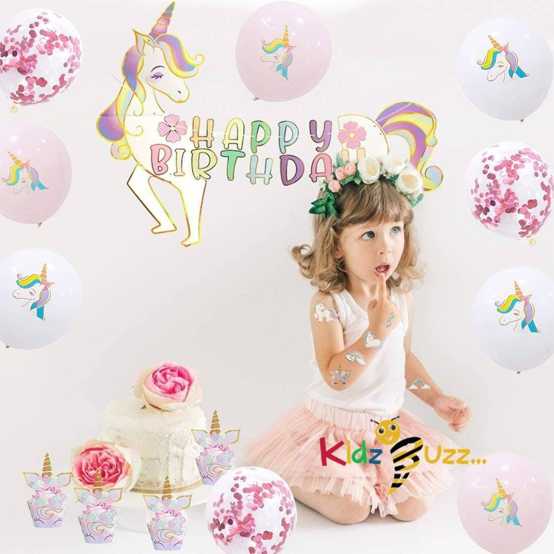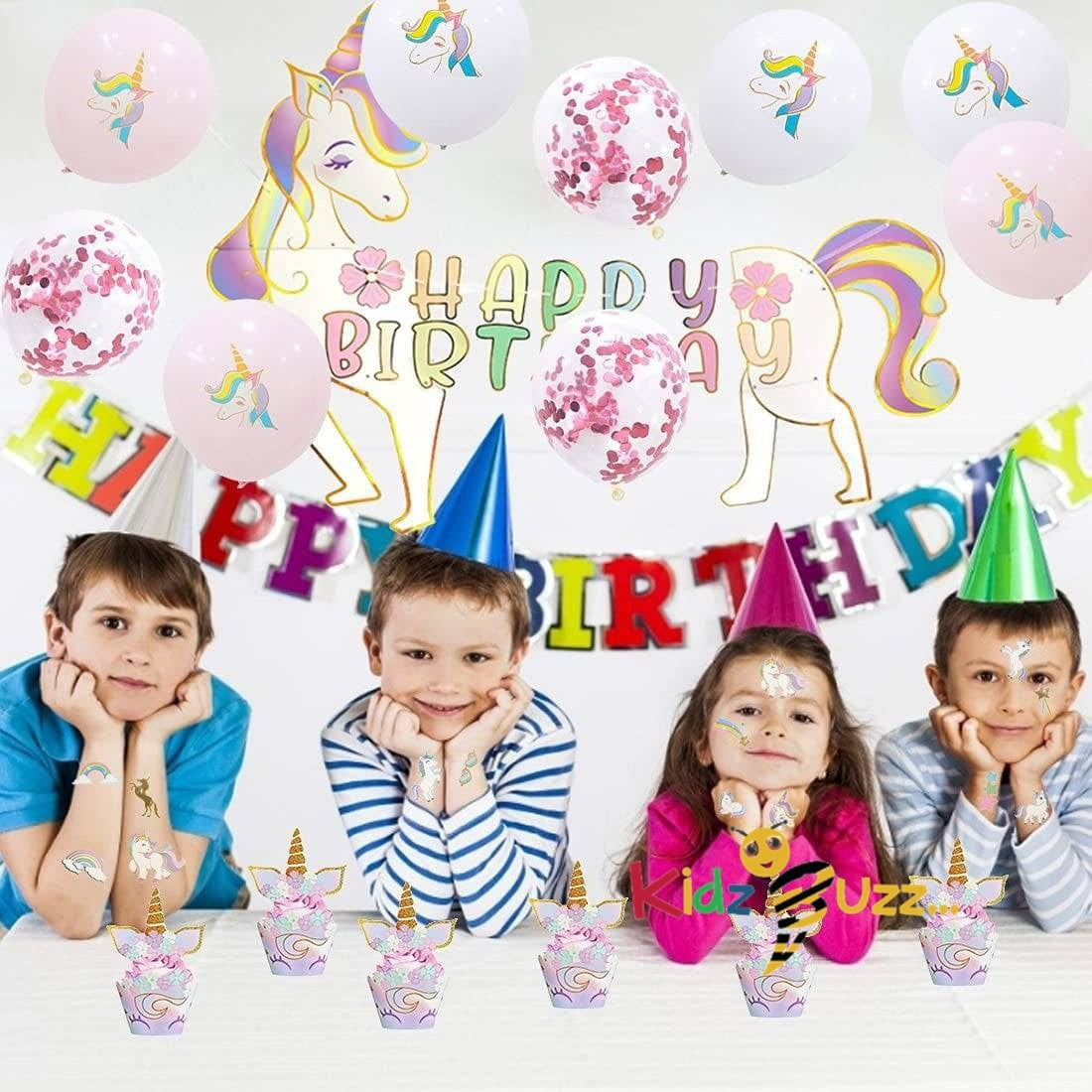- 【Unicorn Balloon Party Pack】-The Pastel Unicorn Birthday Party Decorations set, includes that you will need for assembly: 16 pc unicorn latex balloon, 16 pc unicorn tattoos, 1 Unicorn Happy Birthday Banner, 8pcs Cake Toppers, double sides printed with gold unicorn horn.