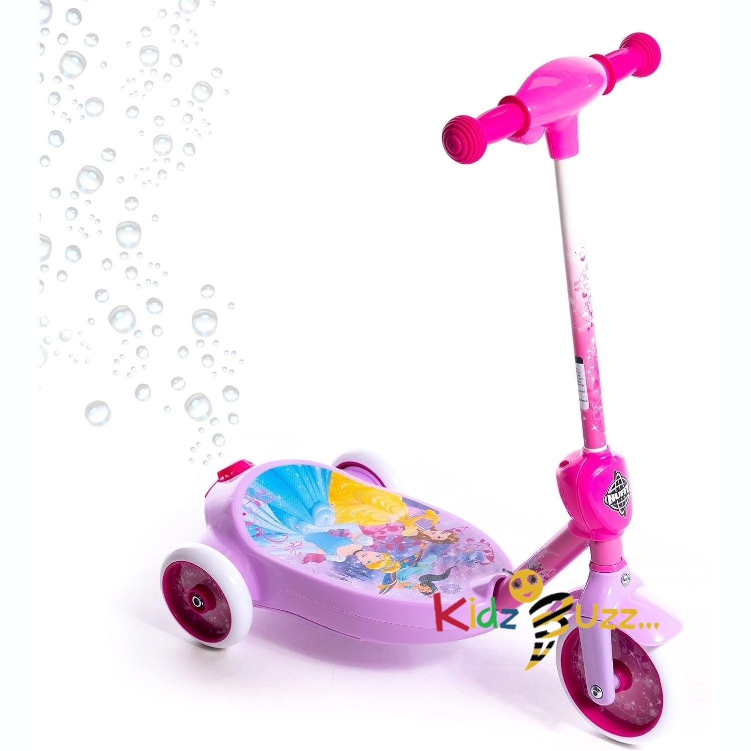 - Ideal for toddlers - The wide stance brightly coloured deck features everyones favourite Disney Princesses Cinderella, Belle and Jasmine. The wide platform allows for safe standing and control and easily powered by a single button. Bubbles can be switched on or off via the convenient control button on the side.