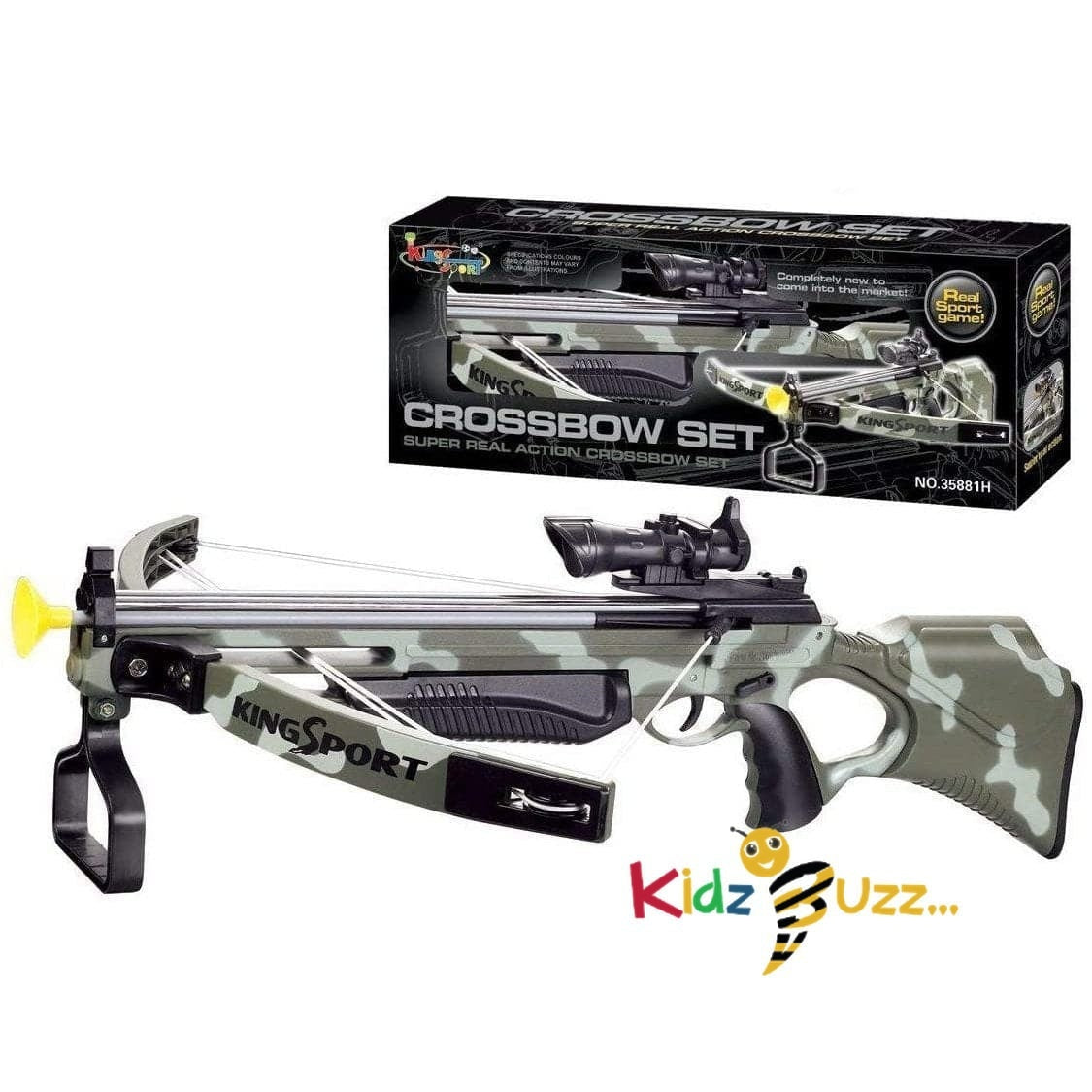 3 Safety arrows are tipped with suction cups. KingSport Super Real Action Crossbow Set Kingsport With a scoped out crossbow, nothing will be invincible to your little hunter. Sturdy, high quality plastic cross bow. This Crossbow can shoot up to 20 Feet and beyond!
