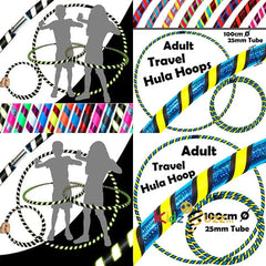 - Kids and Adult Hula Hoops. Fold-down Travel Hula Hoop For Children + Strap. High-quality travel hula hoops made in the UK and sold in thousands around the world! * Hoop Specs: Weight: 420gr (14.8oz), Diameter: 85cm (33.5 inches), Tube Thickness: 20mm (0.8 inch).Color May Various