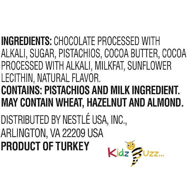- Ingredients 'CHOCOLATE PROCESSED WITH ALKALI, SUGAR, PISTACHIOS, COCO BUTTER, COCOA PROCESSED WITH ALKALI, MILKFAT, SUNFLOWER LECITHIN, VANILLIN (ARTIFICIAL FLAVOR).'