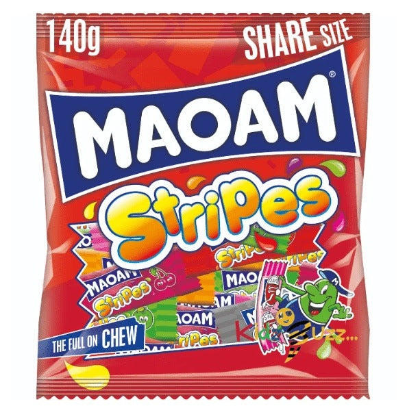 Maoam Stripes, 140gFruit and Cola Flavour Chewy Sweets. No artificial colours. Which one's your favourite flavour?Cola, strawberry, apple, raspberry, orange, cherryNothing chews like a Maoam® and there's so many Maoams to chewse fromFull on...till it's gone Ingredients:Sugar, Glucose Syrup, Palm Fat, Humectant: Sorbitol Syrup, Gelatine, Acid: Citric Acid, Flavouring, Fruit...