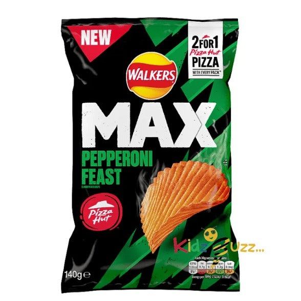 - Delicious Walkers Max Pepperoni Feast flavour ridged sharing crisps