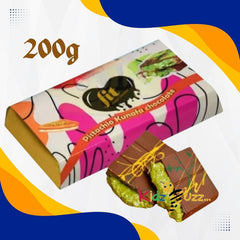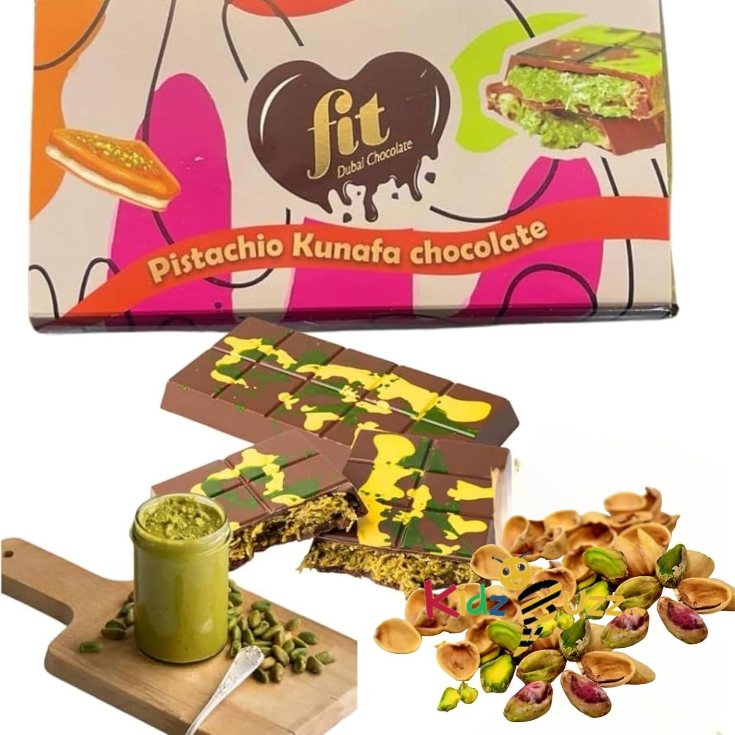- AUTHENTIC DUBAI CHOCOLATE BAR 200G – Experience the rich taste of Dubai with this luxurious Pistachio Kunafa Fit chocolate bar. A perfect blend of smooth milk chocolate, crunchy pistachios, and crispy kunefe layers.