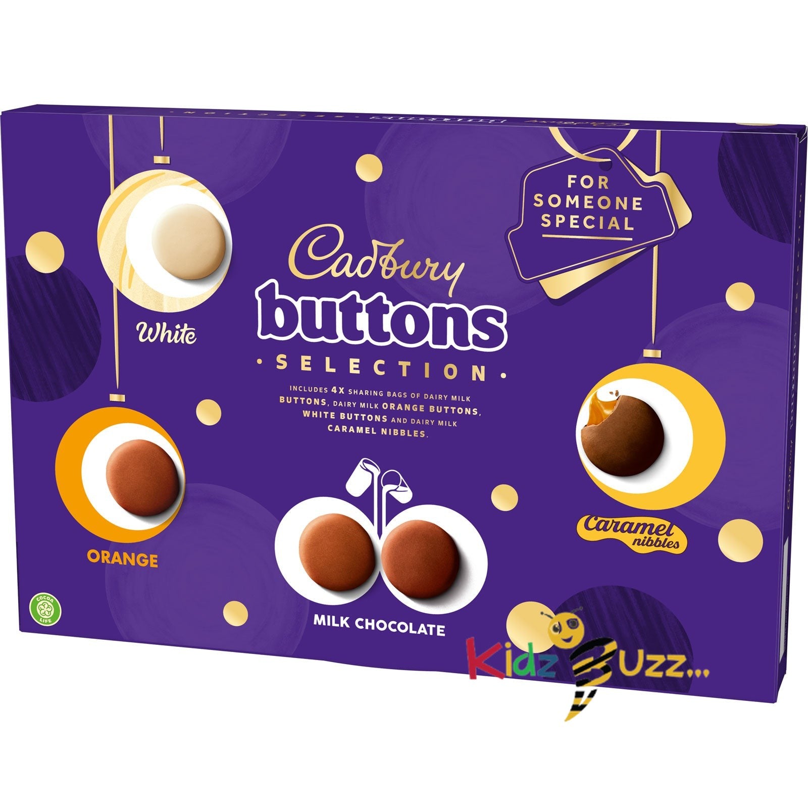 FESTIVE VARIETY: A 340g selection box with Cadbury Milk, Orange, and Caramel Buttons for a joyful holiday treat DELICIOUS ASSORTMENT: Includes smooth Milk Buttons, zesty Orange Buttons, and rich Caramel Nibbles in one festive pack PERFECT GIFT: Ideal stocking filler or small Christmas gift for chocolate lovers of all ages...