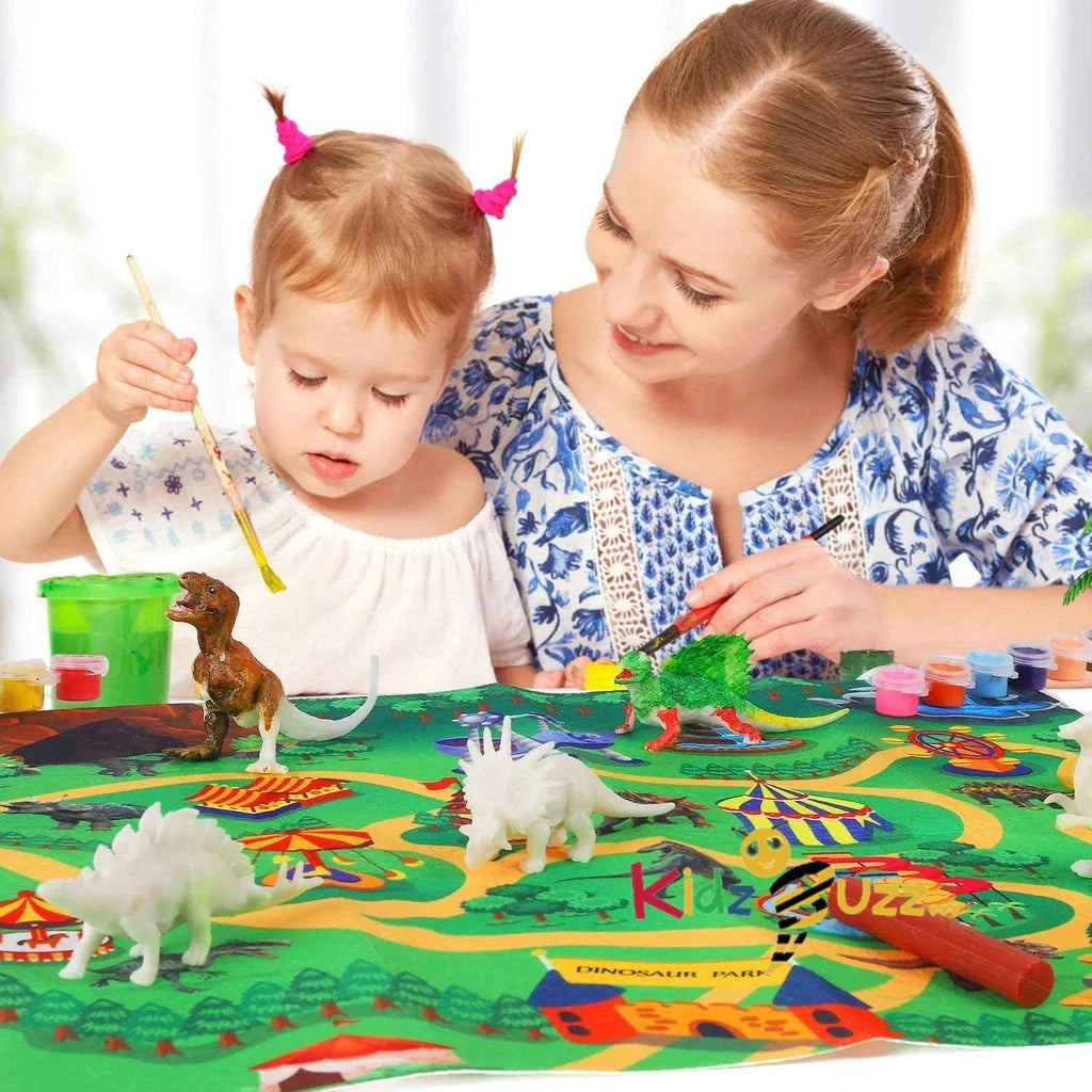 Dinosaur Toy Painting Kit】Our DIY animals painting kit includes 4 different dinosaurs, 4 dinosaur pull-back cars, 1 play mat, 1 apron, 1 sleeve, 2 trees, 2 wood tubes, 2 stones, 2 rockery, 2 paint brushes, 2 palettes, 2 pieces of cartoon dinosaur stickers. The craft painting kit comes with everything...