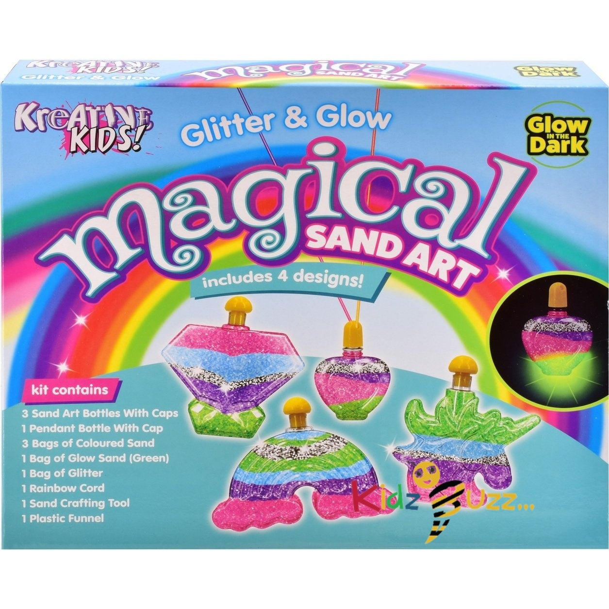Glow in the dark magical sand art set, includes 4 designs. Kit contains: 3 sand art bottles with caps 1 pendant bottle with cap 3 bags of coloured sand 1 bag of glow sand (green) 1 bag of glitter 1 rainbow card 1 sand crafting tool 1 plastic funnel