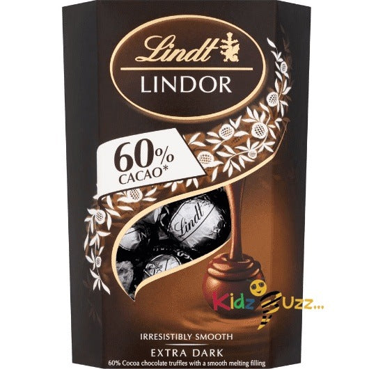 Lindt Lindor 60% Dark Chocolate Truffles Carton 200G Extra dark chocolate truffles with a smooth melting filling Ingredients Cocoa Mass, Sugar, Vegetable Fat (Coconut, Palm Kernel), Cocoa Butter, Anhydrous Milk Fat, Whole Milk Powder, Emulsifier (Soya Lecithin), Skimmed Milk Powder, Lactose, Vanilla Beans, Flavourings, Barley Malt Extract, Extra Dark Chocolate contains: Cocoa Solids: 60% minimum Allergy Information May contain Hazelnuts...