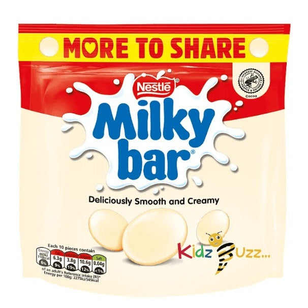 Milkybar Big Share Bag, 176g Enjoy the great taste of Milkybar®. Great tasting creamy smooth white chocolate, enjoy milky deliciousness with no artificial colours, flavours or preservatives. Giant white chocolate pieces made from Milkybar® chocolate, Perfect for sharing, Deliciously creamy-tasting white chocolate, No artificial colours, flavours of preservatives, Rainforest Alliance...