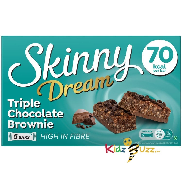 Skinny Dream Triple Chocolate Brownie Bars 5pk. Enjoy a low calorie snack with these special edition Skinny Dream Cherry Bakewell bars. High in fibre, affordable and less than 70 kcalories per bar, indulge in a tasty treat free of guilt. 5 pack. Flavour: Triple Chocolate Brownie