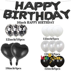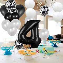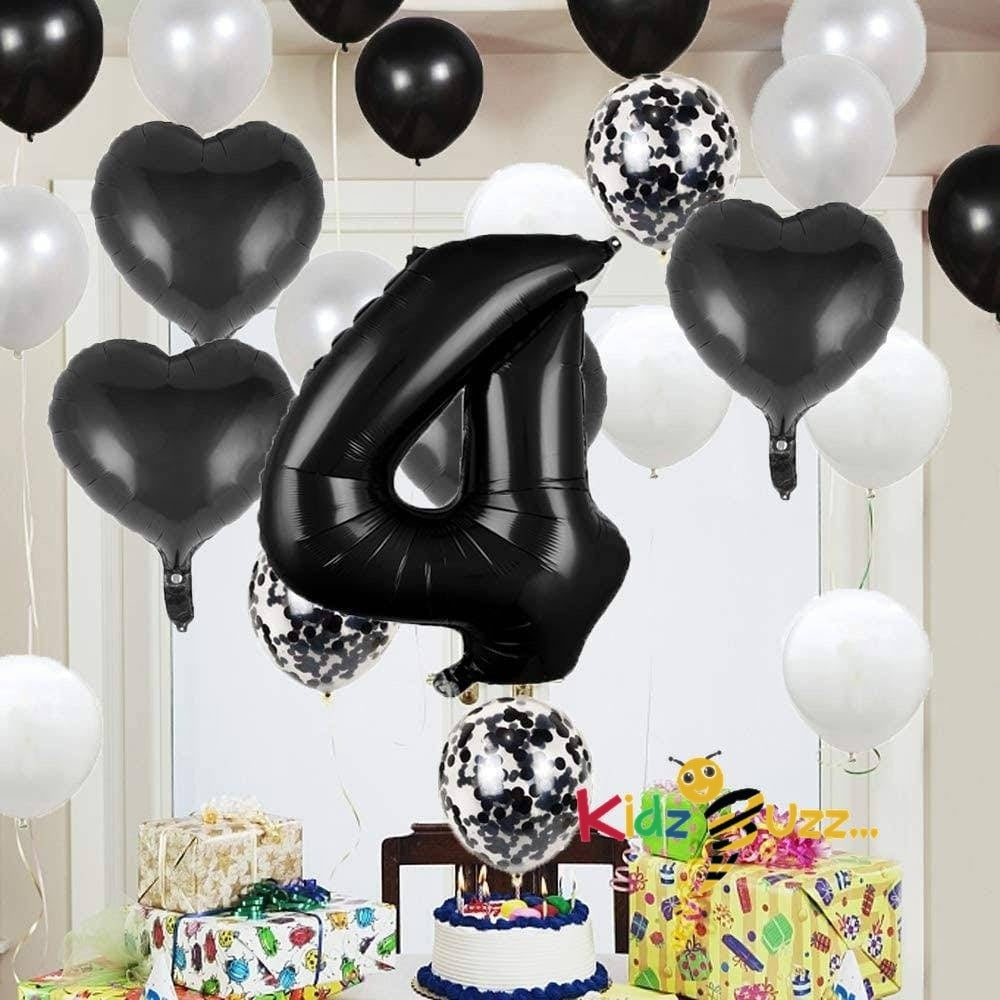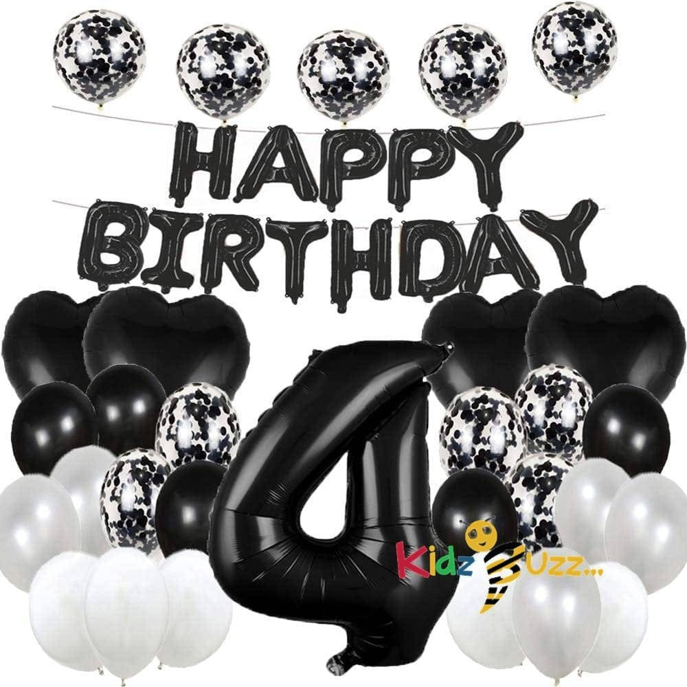 - 4th Birthday Supplies Package Includes: 40 Inch Black foil balloons "4" set, 16 inch "HAPPY BIRTHDAY DAY" banner balloons,4pcs 18 inch loving heart balloons,10 pcs Black confetti balloons, 5pcs Black latex balloons,5pcs silver latex balloons and 5pcs white latex balloons.The birthday set is perfect for birthday celebration